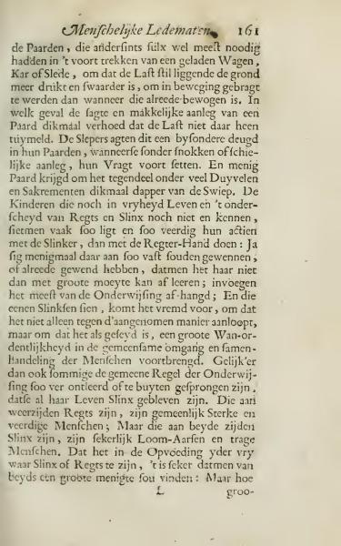 The horses, which otherwise often needed to pull a loaded wagon, cart or sled, because the load lying still is heavier and presses more on the ground, would start moving than when it is already in motion. In this case, the gentle and easy disposition of a horse often prevents the load from toppling over. The drivers considered this a particular virtue in their horses, when they set out their load without fits or abrupt movements. And many a horse, to the contrary, under many devils and sacraments, often courageously from the whip. The children who still live in freedom and do not yet know the difference between right and left, often pretend so easily and deftly their actions with the left hand, than with the right hand: Yes often they would so firmly get used to it; or have already become accustomed, that they cannot unlearn it with great difficulty; therefore most of the teaching depends; And those who see a left-handed person, find it strange, because it not only runs contrary to the accepted manner, but because it as such, produces a great disorder in the common interaction and cooperation of people. Similarly, then some, who have violated the common rule of teaching so far or have escaped beyond it, that they have remained left throughout their lives. Those on both sides who are right-handed, are generally strong and deft people; But those who are left-handed, are certainly clumsy and slow people. That in education everyone is free to be left or right, it is certain that from both a large number would be found; But how