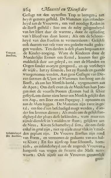 Among animals, no species have their udders or breasts situated as high as in humans, except for apes; because they, like humans, hold their young with their forelimbs or 'arms' (and I might say, nothing resembles a human more closely than an ape, a boor, or a parrot) to the breast. The 'Mammen' are two in number, so if one were damaged, the other could still serve; also, to ensure the symmetry and balance of this part of the body; since just one would stand in the middle; similar to the nose, chin, and private parts that are single in number, and not on the side but right in the center.
