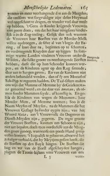 Larger and more hanging down than those of maidens; who quite often take care to wear this household attire properly fastened, and take great pride in doing so. Child-bearing women do not gladly do this because it is somewhat hindering in nursing. Likewise, when women want to dry out their breasts from mother's milk, they start this from the beginning of childbirth, or shortly thereafter, by lifting them and placing drying herbs upon them. In some warm countries, there are women among the indigenous peoples with such large and drooping breasts that they can throw them over their shoulders, and while sitting, allow the children on their backs to suckle from them. The children were treated as if they were managing a pouch or sackpipe. Language scholars tell us that the terms 'Mamme' or 'Memme' among the Greeks were called 'Maze', and that from there, the word 'Amazon' derives, as if saying 'without breasts'. Just as children, because of the breasts, call their Mother 'Mem' or 'Memme'; thus the name 'Meyssen' or 'Maysen', which is peculiar to the female gender, comes from the word 'Maze', given to womenfolk who are daughters and servants. The proper size of a woman's breasts, came to be beautiful, not just determined, but decided as being ample enough when a good hand could grasp them fully. It is hard to believe, though Schaliger reported, that he saw women whose breasts hung down to their waist. The breasts that hang far and separate from the chest bother the viewers of women with a modest disposition.