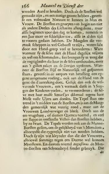 The text discusses the growth and characteristics of breasts in both men and women, noting how regular massaging can promote development. It also describes the differences between the breasts of fertile and infertile women and includes observations about men's breasts. The text highlights the superficial beauty of breasts, citing Augustine's observations that men's breasts serve no practical purpose.
