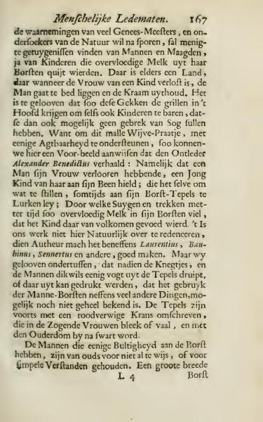According to the observations of many Medical Masters and researchers of Nature, one will find numerous testimonies of men and maidens, and even children who lost abundant milk from their breasts. In a certain country, when a woman gives birth, the man would lie in bed and endure the confinement period. It is believed that if such fools got it into their heads to bear children themselves, they might also not lack the ability to nurse. To support this absurd tale with some credibility, we can refer to the example told by the anatomist Alexander Benedictus, who recounted that a man, having lost his wife, held a young child to his leg; who, to soothe the child, would sometimes let it suckle at his chest; as a result, so much milk began to flow from his breasts that the child was fully nourished by it. It is not our place to reason over such natural anomalies in detail, for authors like Laurentius, Bauhinus, Semertus, and others may make it clearer. Yet, we believe, however, that after the young lads and men often expel some fluid from their nipples, or can express it, that the function of male breasts, alongside many other things, is still not entirely known. The nipples are described as being surrounded by a reddish circle, which in nursing women appear pale or dull and turn nearly black with age.