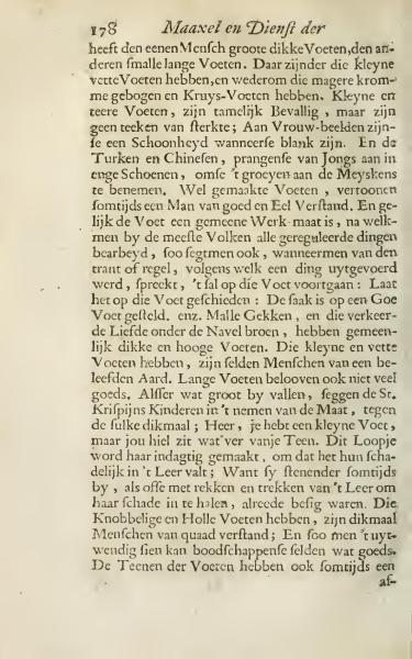 one person may have large thick feet while another has small long feet. Some have small fat feet, while others have thin, bent, and cross-shaped feet. Small and delicate feet are fairly charming but do not indicate strength. Female statues are considered beautiful when their feet are slender. The Turks and Chinese often bind young boys' feet in tight shoes, restricting their growth. Well-formed feet sometimes indicate a person of good intelligence. Just as the foot serves as a general measure in many cultures, so does one understand order and rule when discussing procedures. For example, a case is set on a firm footing. Fools and those who confuse love with things below the navel generally have thick and high feet. Those with small fat feet are rarely people with refined natures. Long feet also do not promise much good. It is said among St. Crispin's children to take size opposite to what is common; Sir, you have a small foot, but your heel is far from your toe. This saying makes them aware of damage to shoes: standing on them too long may already cause harm. Those with knobby and hollow feet are often people of poor understanding, and as you can visibly see, such feet seldom bring good messages. The toes of the feet also sometimes...