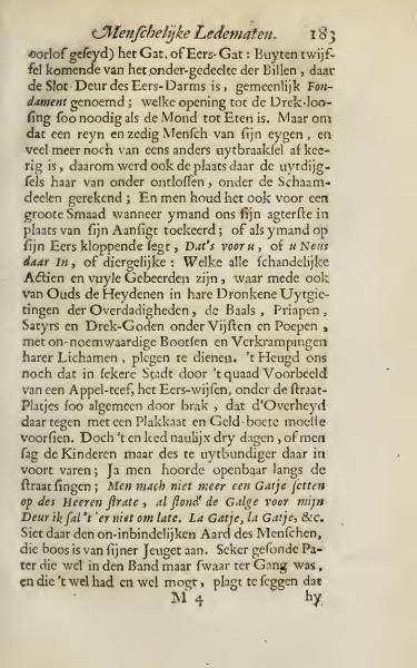 The passage discusses the anatomical part called the "Eers-Gat" or "Fundament," which is essentially an opening at the lower region of the body, important for the excretion process, akin to the mouth's role in eating. It is considered inappropriate and offensive for someone to expose or point this area towards others, highlighting cultural taboos and norms around decency and exposure. The text also references the indecent behaviors of ancient Heathens during their drunken excesses, involving actions considered shameful, like showing bodily parts or performing lewd acts—this is seen as a breach of societal norms and dignity. The passage concludes by commenting on the unruly nature of humans since youth, citing an incident involving a local pastor in a city where improper exposure and behavior had become widespread, prompting the authorities to issue penalties.