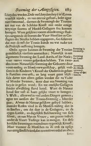 In our opinion, the diversity of faces can be easily observed in four aspects; namely, in a general diversity of national character or nation, which we discussed earlier. Secondly, in a natural diversity of birth through procreation and blood relations, much seen in children resembling the lineage of their elders across entire families, continuing over time such that it reflects not only the father's or mother's likeness but a mixture of both can be seen, and this likeness continues without deviation across multiple generations. Nature strongly retains its similarity: which, although common in many things, particularly holds true concerning the diversity of faces. Nature, as we have mentioned, finds more reason in human reproduction than in animals, because there the thoughts, and personal love, and daily reflection on oneself, and on man and woman, can have a considerable influence on offspring. These notable diversities are properly called lineage; but when people grow to resemble the features and appearance of any animal, that is called simply and solely.