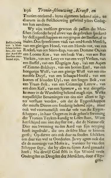 We are often accustomed to depict the passions of humans, particularly as we speak of deficiencies, through the traits and inclinations of animals. Thus, one often speaks of a "Dog-like Person," a greedy dog, a dog's face, a rogue, a bull's head, a dumb ox, a sluggish cow, a cunning fox, a dull piglet, a lion, and a filthy pig, a buffalo, a clever monkey, a monkey or a boorish person, a hungry wolf, a greedy wolf, an innocent dove, a sheep's head, a dull or bloody owl, a stubborn goat, a crying goat, a fierce lion, a dumb calf, a starling, and such are known in common speech. These descriptive names are not only easily understood because the characteristics of most animals are familiar to us, but also mainly because many of these characteristics are visibly and entirely apparent in their facial expressions to those who study physiognomy. It does not seem obscure to us that Nature has impressed upon each creature a tendency according to its nature, which clearly reveals itself to us, so that we can judge them properly. In fact, we believe this is also Moses' view when he says that the Creator made everything according to its nature. Since God himself in his Word describes many vices and virtues of humans through the traits...