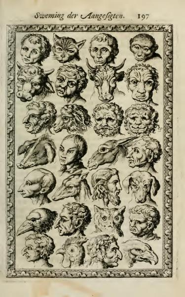 Expression of Faces Page Summary: The text translates to "Expression of Faces," accompanying an illustration of human and animal faces. This reflects a study of facial expressions and features. << Go to previous page Go to Beginning of this Book Go to Index of this Book's pages Go to list of Books Go to next page >>
