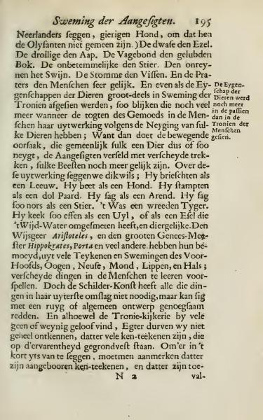 The Dutch say, "greedy dog," because elephants are not common to them. The foolish donkey, the amusing monkey, the vagabond goat, the untamable bull, the impure pig, the mute fish, and even the chatterers are very similar to humans. Just as the characteristics of animals are largely seen in the expression of their faces, these become even more apparent when the emotions within people manifest according to the inclination of such animals. The moving cause, which usually inclines an animal thus, reflects expressions with various features that make these beasts even more similar to people. We often say, he roars like a lion, bites like a dog, kicks like a mad horse, sees like an eagle, is as stern as a bull, was a cruel tiger. He looked as flat as an owl or, like a donkey that measured the wild water, and the like. The philosopher Aristotle, and the great healer Hippocrates, Porta and many others, have endeavored to derive many signs and expressions from the forehead, eyes, nose, mouth, lips, and neck to predict various things in people. Yet, the art of painting does not need all these things in its utmost elaboration, but can manage with a rough or general scheme adequately. And although many do not place much faith in facial observation, we cannot entirely deny that there are many signs founded on experience. In short, it must be noted that some signs are innate, and others are acquired.