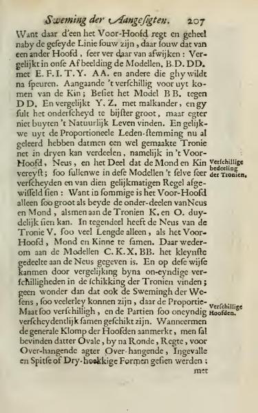 Because in one case the forehead might be straight and close to the specified line, while in another, it may deviate significantly: Compare in our illustration the Models B.D. DD. with E.F.I.T.Y. AA. and others you might want to examine. Regarding the different forward projection of the chin; Observe Model B.B. against DD. And compare Y. Z. with each other, and you will find the difference quite large, though not outside of what is naturally possible. And as we've learned from proportional measurements that a well-constructed face can be divided into three parts, namely the forehead, nose, and the part that includes the mouth and chin; so we will see in these models the same very different from that uniform rule: In some cases, the forehead alone is as large as both the lower parts of the nose and mouth, as can be clearly seen in the faces K. and O. Conversely, the nose of face V. has as much length alone as the forehead, mouth, and chin combined. Conversely, in models C. K.X. BB., the smallest portion is given to the nose. And in this manner, almost endless variations can be found in the arrangement of faces; it's no wonder that there can also be such diverse expressions in appearances, where proportion measurements are so different, and the parts so infinitely differently arranged. When examining the general shapes of heads, one will find that there are oval, nearly round, straight, forward-hanging, backward-hanging, inserted and pointed or triangular shapes to be seen;