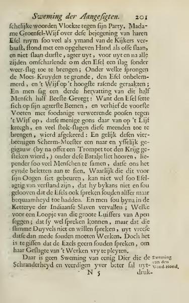 People witnessed another round of this half-human, half-animal fight. The donkey rose on its hind legs and lifted its front legs in such defensive postures against the woman that many large bruises appeared on her body, and many stick blows she intended were deflected. Just like these four-legged fencing masters, it sounded like a terrible screech (comparable to the offering of a Trumpet to war), attracting a crowd of people so that they blocked the view of the end. Truly, anyone who witnessed this can hardly be so donkey-like in understanding as to not believe that donkeys could also speak if they but had the ability. One might nearly fall into the heresy of Indian Slaves; which is a saying of those great pranksters of Apes; that they can speak well, but the sly devils do not want to speak, for fear that they would then also have to work. Yet it is to be guessed that the donkeys would willingly speak to avoid being forced to work. There is no swimming of any animal who will better express cunningness and defend zeal.