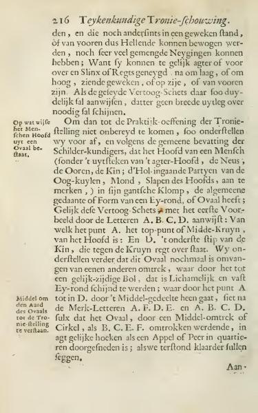 To be prepared for the practical exercise of portraying facial features, we first assume, according to the common understanding of painters, that the human head (without protruding the back head, nose, ears, chin; the inward parts of the eye sockets, mouth, temples of the head, to be noted,) in its entirety, generally possesses the shape or form of an oval or egg shape. As this illustration indicates with the first example through the letters A, B, C, D: of which point A is the top point or middle of the crown of the head, and D being the lowest point of the chin that aligns directly with the crown.