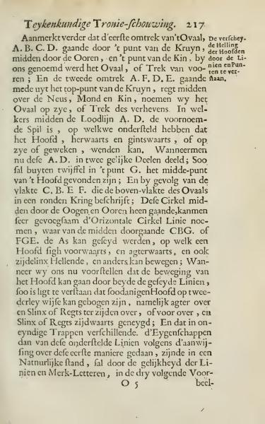 It is noted further that the first outline of the Oval, A.B.C.D., passes through the top of the Skull, the center through the Ears, and the point of the Chin, which we call the Oval, or Front view. The second outline A.F.D.E. also extending from the Skull top, straight across the Nose, Mouth, and Chin, we call the Side Oval, or Raised Profile. At the center is the vertical line A.D., which serves as the Axis, around which the Head can tilt left or right, or turn sideways. If we divide this A.D. into two equal parts; then undoubtedly, point G, the center point of the Head will be found; and then as a result, from the plane C.B.E.F., which describes the upper surface of the Oval in a circular shape; this Circle passes through the Eyes and Ears, known as the Horizontal Circle Line, where the centrally passing C.B.G. or F.G.E. may be called the Axis, on which a Head can move forward and backward, and also tilt leftward, and otherwise move; When we now imagine that the movement of the Head can pass through both outlined Lines, it is easy to understand that such a Head can be tilted in two different ways, namely backward and towards the left or right side, or forward, and inclined sideways left or right; And that these movements vary infinitely. The specifics of these outlined Lines according to the instructions done in this first manner will, in a Natural position, be made clear by the similarity of the Lines and Reference Letters, in the three following Examples.