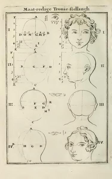 The text, translated from Dutch, essentially refers to the accurate measurement of facial proportions. It appears to guide artists or students in understanding how to proportion a human head correctly. This is likely part of a larger instructional work on artistic anatomy and design.