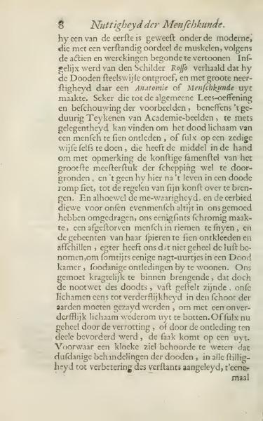 He was one of the first among the moderns to reasonably demonstrate the muscles, according to actions and workings. Similarly, it was told of the painter Rosso that he surreptitiously unearthed the dead and with great dedication created an anatomy or study of humans from them. Certainly, those who, in general reading and examination of examples, together with the continual drawing of academic figures, find the opportunity to dissect a human body, or to do so themselves in a decent manner, have the means to thoroughly understand the artistic composition of the greatest masterpiece of creation. What they observe here in a lifeless body, they can apply to the rules of their art. Although the dignity and respect that we always carry in our minds for our fellow humans somewhat discourages us, the custom of binding a deceased person in straps and seeing the bones stripped of their muscles, detach some of that reluctance. Sometimes, attending such dissections in a room for the dead brings strongly to mind that, according to the law of necessity, our bodies must eventually be sown in the earth to emerge again as an imperishable body. Whether this is achieved entirely through decomposition or through dissection partially advanced, the matter is resolved. Indeed, a vigorous soul should know that such treatments of the dead, quietly conducted, lead to the improvement of the mind altogether.