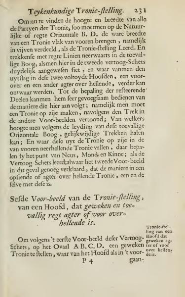 To determine the height and width of all parts of the face, one must align with the natural or straight horizontal B.D. to bring the true width of a frontal face, divided into five parts, as taught by the 'Tronie-stelling' method (a technique for positioning faces). One should draw straight lines downwards intersecting the arcs. This is shown clearly in the second sketch and indicates the alignment in two completed heads, one leaning forward and another tilting backward.