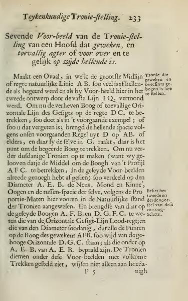 Create an Oval, in which the largest Central Line or straight natural Line A B is inclined as much as desired and as shown in the example of the second design through the solid Line I Q. Now, to attach the Elevated Arch or Incidental Horizontal Line of the Features on the right D C, do as in the preceding example; or if you've forgotten that, bring the inclined space according to our previous Rule from D to AB or elsewhere, and where it touches G, there is the point to draw the desired Arch. To now compose further such a Tronie (because we believe that the means to connect the Arc of the Profile A F C you have already seen enough in the examples given), divide on the Diameter A. E. B the Nose, Mouth, and Chin, Eyes, and the intervening space thereof according to the Proportional Measures shown here previously in the Natural position of the Tronie. And then bring the mentioned Arches A. F. B and D. G. F. C to coincide with those of the Horizontal Feature-Line perpendicular to the Diameter so that all Points on the Arc of the recumbent AFB are as wide as those on the bent Horizontal DGC are defined by A. E. B from A. E. B. The Tronie thus fully drawn under these Examples not only indicates how to.