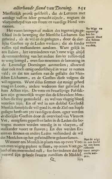 The act of creating or maintaining balance in the movement of human bodies occurs as swiftly as the will and thoughts, through the animal spirits acting on the limbs; which work without interrupting each other. Just as in a balance, the decrease of one weight always brings about the increase of another without delay, so must we note the effects on active movements; although some distinctions can still be observed in regard to the form of human bodies, and the spirits governing them as per the will. Thus, we see that some are completely sluggish and slow, while others are very swift in their actions. The overweight and heavy individuals are generally slower than the more agile people who are lean and supplied with quick blood. Even in a person of double flesh, sometimes the will is strong, and the soul and quick thought intend to do something agile, yet the animal spirits are somewhat compressed and hindered by the abundance of flesh and fat in the limbs, which must either flow agilely or propel each other forth; thereby arms and legs and other limbs are prevented from swiftly obeying the will of the person.