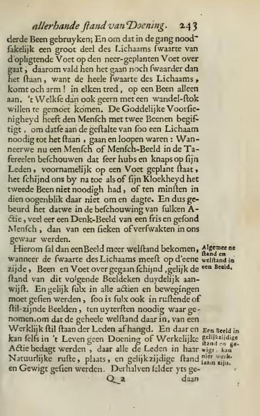 The text discusses the mechanics and aesthetics of human posture and movement. It explains how the body's weight shifts between the legs and the significance of maintaining elegance in both dynamic and static poses. The text suggests that observing human figures in art provides insight into a person's health and vitality.