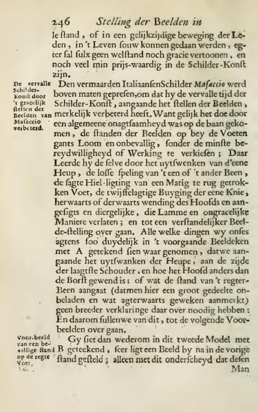 The renowned Italian painter Masaccio was highly praised because he notably improved the degenerate state of Painting concerning the positioning of Figures. As it was common at the time due to general neglect, the posture of Figures with both feet firmly on the ground was clumsy and ungraceful, without the least willingness or effectiveness in their action. He taught to depart from such limp and graceless ways by slightly shifting one Hip, the loose play of either Leg, the gentle heel-lifting of a moderately retracted Foot, the ambiguous bending of one Knee, the turning of the Head's gaze either way, and similar, more understandable positioning. All these elements, which are so clearly illustrated in the preceding diagram labeled A, about the swaying of the Hips, the side of the lower Shoulder, and how the Head is turned differently from the Chest, or regarding the position of the right leg (notably shown here largely unburdened and slightly shifted backward), require no further explanation; Therefore, we shall proceed from this to the following Examples.