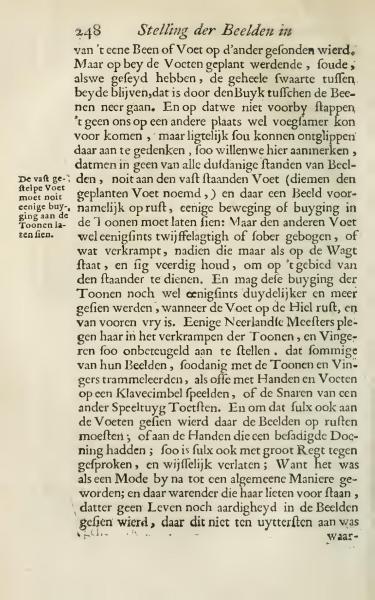 When one leg or foot would be found upon the other, both feet should be planted, as we've said, the entire weight stays between them, resting through the belly between the legs. And so that we don't step over what's appropriate in another place, this must be gently remembered: in any of the various positions of figures, never let the weight rest on the planted foot without showing any bending or movement in the toes. But the other foot, somewhat uncertain or soberly bent, even slightly cramped, standing as if ready to serve the standing area, can show this bending of the toes more clearly and obviously when the foot rests on the heel and is free at the front. Some Dutch masters practiced cramping the toes and fingers so unchecked, that some of their figures, thus trammelled with toes and fingers, seemed to play on a clavier with their hands and feet, or pluck the strings of another instrument. Because such a thing could also be seen in the feet where the figures rested, or in the hands that held a settled doctrine; this was therefore rightly argued against, and wisely abandoned; because it was almost adopted as a general manner; and those who put forward claimed it, let no life nor interest in the figures be perceived, for this was not to the extreme.