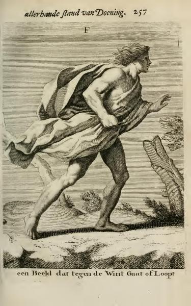 The text describes a figure moving against the wind, emphasizing dynamic action and posture. This reflects the book's focus on illustrating human movement within the context of art and design. The image aligns with this theme by depicting a figure engaged with natural forces.