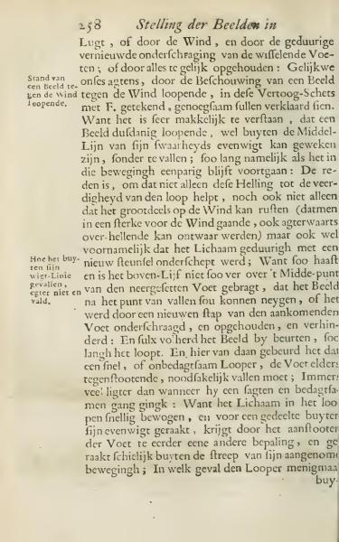 Air, or by the Wind, and by the continuous renewed support of the alternating feet; or by everything being held simultaneously. As we observe through the representation of a statue walking against the wind, in this explanatory sketch marked with F, it will be sufficiently explained. For it is quite easy to understand that a statue walking steadily, even outside the center line of its balance of weight, can proceed without falling, as long as it remains evenly in that movement: The reason is that not only does this inclination assist in the agility of walking, nor does it solely rest largely on the wind (as one might be observed leaning backward when moving strongly against the wind) but mainly because the body is continuously intercepted with new support; Because as soon as the upper body is not shifted over the center point of the foot that has been set down, the statue could veer towards the point of falling, or it is supported by a new step from the upcoming foot, and held up, and prevented: And thus the statue alternates continuously, as long as it proceeds. And henceforth it happens that a fast, or careless walker, who thrusts the foot against something else, must necessarily fall; Indeed, much more easily than if he was going at a slow and careful pace: For the body, moved quickly in walking, and to some extent losing balance, gains another direction through the impact of the foot, and suddenly shifts outside its assumed line of movement; In such a case, the walker often falls.