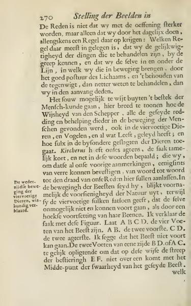 The text discusses the practice of acquiring balance and handling motion through daily exercises, emphasizing the importance of posture and counterweight. It explores how the movement wisdom seen in humans is also found in animals and birds, highlighting Kircherus's views on the innate foresight of nature in animal movement. A specific case describes how quadrupeds' movement depends on the angular extension of their legs, using a figurative explanation.