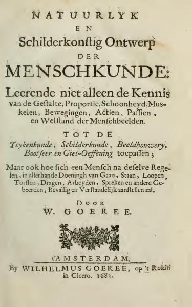 This title page introduces a book that covers the knowledge of form, proportion, and movement of human figures, emphasizing both artistic and practical applications. It instructs readers on drawing, painting, sculpture, and other arts, also focusing on the graceful conduct of individuals through various actions and gestures. The book, authored by Wilhelm Goeree, was published in Amsterdam in 1682.