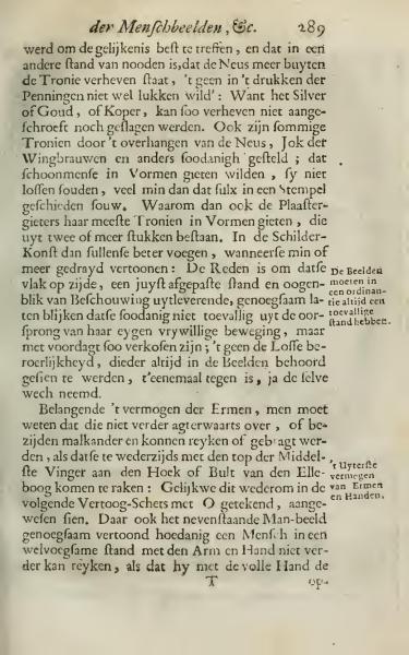 Regarding the capacity of the arms, it must be understood that they cannot extend further backward or sideways, except as they can reach or be brought, only if they touch with the tip of the middle finger on the edge or bulge of the elbow: This is likewise shown again in the following diagram marked O. The adjacent statue sufficiently shows how a person cannot extend the arm and hand in a proper posture further than with the full hand, demonstrating the utmost capabilities of arms and hands.