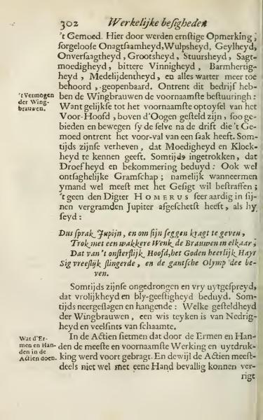 The Mind. Here, sincere Observation, carefree Carelessness, Lasciviousness, Lustfulness, Courage, Greatness, Sternness, Gentleness, bitter Aggressiveness, Mercy, Compassion, and everything belonging to these qualities are revealed. Regarding this matter, the Eyebrows have the most significant influence: Because, just as they are positioned as the foremost ornaments of the Forehead, above the Eyes, they command and move according to the impulse the Mind has regarding the event of a situation. Sometimes they are raised, indicating Courage and Boldness. Sometimes they are furrowed, indicating Sorrow and concern; Also, sometimes, terrible Anger; especially when one wishes to reprimand someone most with the Face; as the poet Homer has very aptly illustrated in his depiction of an angry Jupiter when he said: