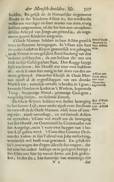 The text discusses the differences in actions and perceptions between children, old men, and old women. It highlights how children with refined movements from a young age are viewed, while describing old men as having slow, stiff movements, likened to a drunken state. The text also describes old women's quicker actions compared to men but highlights similar stiffness in the lower body, referencing artistic observations by Rubens.