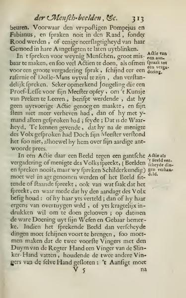 In an act where a statue speaks against an entire assembly or multitude of people (statues and paintings do not speak, but we speak metaphorically), it must be considered whether the statue is speaking while seated or standing; also what subject it addresses, and how it keeps the audience engaged: whether it tells them something; or attempts to convince them of something, or powerfully impress something upon them to make them believe; to notice the real action from its essence and gestures. If the speaking statue then needs to present various things, it should be shown that the two foremost fingers along with the thumb of the right hand should grasp a finger of the left hand, keeping the two other fingers of the same hand closed: the expression must