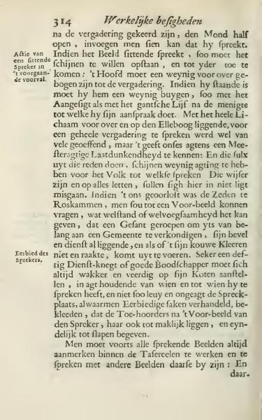 During the meeting, when turned, the mouth is half open, making it appear as if speaking. If the image of the speaker is sitting, it should seem to be about to rise and move towards the audience: the head should tilt forward toward the assembly. If standing, the speaker should bend slightly, both in the face and the entire body, towards the crowd to whom the address is made. Leaning forward and resting on the elbow when addressing an entire assembly is often practiced but, in our opinion, demonstrates a masterful arrogance. Those who behave this way seem to lack regard for the audience they are addressing. Those who are wiser and attentive will not easily make this mistake here. If customs were permissible for us to criticize, one might ask, what dignity or propriety it lends that a messenger, called to announce something significant to a community, would perform his duties laying down as if his attire were beyond his touch? Indeed, a dignified servant or good messenger should always present himself alert and ready at his post, considering whom he addresses and not allowing looseness and irreverence regardless of the place where respectful matters are handled. This causes listeners to, after observing the speaker, lie comfortably down and eventually fall asleep. Moreover, one should always observe speaking images working within the scenes and speaking with other images present there.