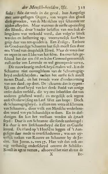 Those who wish to make a keen distinction can discern Shame that is unbefitting from modesty; the former usually occurs after an action, while the latter occurs before the undertaking of an action. Shame then is truly a sorrowfulness from the mental images of some of our actions, which we imagine are ridiculed by others and possibly run counter to our teaching and moral law. However, modesty is merely a fear or timidity from shame, preventing a person from doing something disgraceful. In this sense, it can be understood as Syrach says: There is a shame that brings sin, and there is a modesty that delivers honor and favor. To place the hand on the head or overshadow the face was an external sign of mourning and shame among the Jews, see Jeremiah 2:37. Here is then also a wise distinction to be taken into consideration about the Art of Painting, although it is not complete.