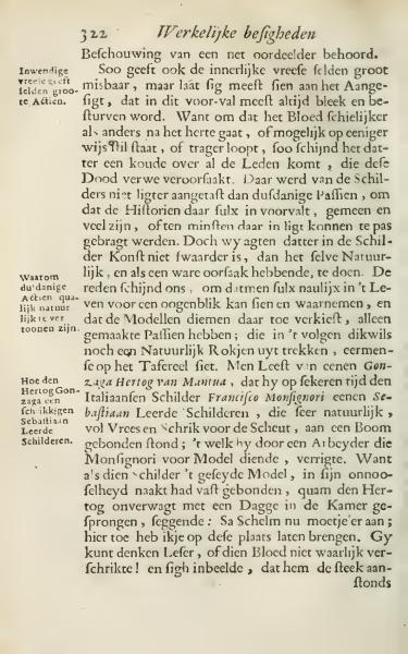 Consideration belongs to a judicious observer. So, too, does internal fear spread great discomfort, but it mainly manifests in the face, which in such cases usually turns pale and distressing. This is because the blood flows more quickly to the heart, or possibly the stance is altered, or movements become slower, which makes it seem that a chill comes over all the limbs, suggesting death. Such dramatic passions have often been lightly portrayed by painters due to the prevalence of such stories, which are common and many, or at least can be applied here. However, we consider that in painting there is no heavier task than depicting the same naturally and as if it were a true cause. The reason seems to us, because such can hardly be seen and perceived momentarily in life, and models who are chosen for this have only fabricated passions; which often still resemble a natural appearance when seen on the canvas. One hears of a Duke Gonzaga of Mantua, who at one time had an Italian painter Francisco Monsignori train a Sebastian in painting, who very naturally, filled with fear and terror of the outstretched blade, stood bound to a tree; which he arranged through a worker serving Monsignori as a model. For when this painter bound the said model with terrifying naked abandon, the Duke unexpectedly burst into the room with a dagger, saying: "So, rogue, now you must feel this; I have brought you here for this purpose. You can imagine, my friend, if that blood did not truly frighten and imagine that the wound immediately..."