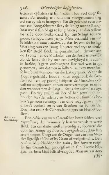 ...setting and collecting his limbs, as much strength as is necessary to bring his intended blow to a proper end: And this happens just as when one sees an archer, aiming with the bowstring fully drawn back, and then simultaneously letting go; by which act he shoots his arrow to a far greater distance. It is recounted of the painter Antoninus Pallairole that he depicted, with great subtlety, the working of an archer, making his image so that one could naturally see in the face, and the chest muscles, that he was controlling his breath with intensity; which, according to us, was well considered because in such an act one has more strength when holding one's breath than when releasing it.