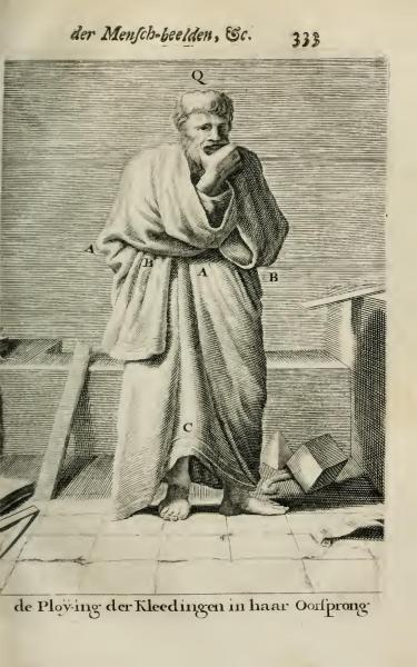 The text is a heading and a caption in Dutch, describing a study of the draping of clothing. It relates to the illustration showcasing how garments might be depicted on a human figure. The focus is on the origin and arrangement of clothing folds.