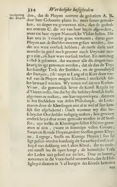 It is stated that the folds around sections A and B, where their origin is, are more closely gathered and folded more deeply than around section C, which has strayed far from its origin and leans more towards its natural plane. This can remind us in passing that folds should only be seen in images if they have a true cause and should not be greater in number or larger or smaller than their true cause permits. One might firmly believe that when all these matters are carefully considered, the artistic lines of the images and the grandeur of the parts, which should never seem too long or too short due to the randomness of the folds, will be clearly preserved. We know that a critic, who commonly pulls the rules of art towards his ears rather than seeking to make them universally applicable, might argue that in the depiction of this philosopher, the limbs are not too well or clearly marked by the clothing. However, when we make the respectful observer aware of how much distinction must be made in the materials from which the garments appear to be taken (since in some cases large, heavy, and round folds, and other materials give small, light, swift, and sharp folds), it will then become apparent how the weight and thickness of such a cloth garment, which mostly hangs loose and open after decomposition, do not entirely match the visible limbs. Furthermore, one must note in this example that the consistent height shown in the hanging of the cloth below...