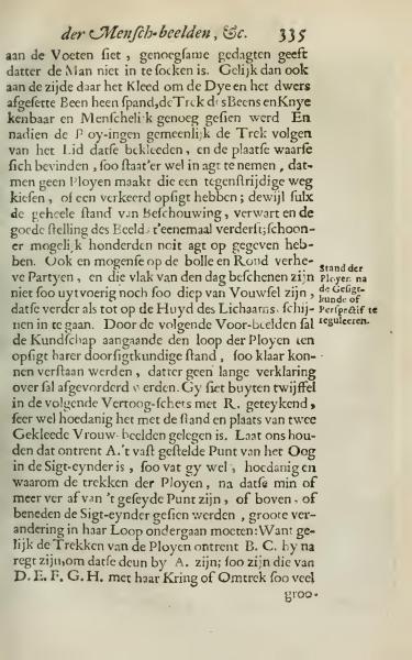 You will no doubt see in the following Demonstration-drawing marked R., very well how the position and place of two Clothed Female Figures lie. Let us keep that around A., the fixed Point of the Eye in the Line of Sight is such, so that you understand well; how and why the attitudes of the Folds, depending on whether they are more or less far from the said Point, or above or below the Line of Sight, must undergo a great change in their Course; for just as the attitudes of the Folds around B. C. are almost correct, because they are close to A.; so are those of D. E. F. G. H. with their Ring or Outline just as great.
