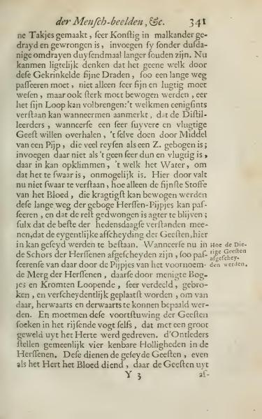 Branches are made, very skillfully twisted together, so intricately that without thousands of turns, they would be infinitely longer. One can think lightly about what passes through these intricately twisted fine threads, which not only must be very fine and light but also must be moved strongly to complete their path. This can be somewhat understood if one considers that distillers, when they want to extract a very pure and volatile spirit, do so through a pipe that winds like a Z. Only something extremely thin and volatile can rise through it, unlike water, which, due to its heaviness, cannot. Therefore, it is not hard to understand why only the finest substances of the blood, which can be moved most forcefully, can pass this long way of bent brain pipes, while the rest is forced to stay behind. Thus, the best minds today think that the true separation of the spirits could exist here. When they are separated in the bark of the brain, they pass through the pipes of the previously mentioned brain marrow, distributed and broken through numerous bends and curves, so that they may be controlled from different directions. This propulsion of spirits should be sought in the rising fluid itself, which is driven out of the heart with great force. Analysts commonly identify four recognizable cavities in the brain. These serve the aforementioned spirits, just as the heart serves the blood, where the spirits originate from.