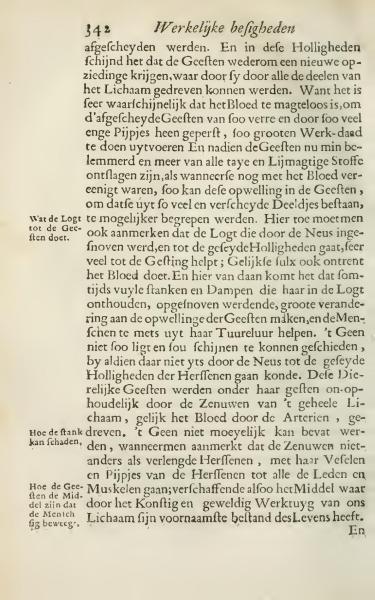 They were separated. It appears that the spirits or essences gain a new rise within these cavities, allowing them to be driven through all the parts of the body. It is very likely that the blood is too weak to push the separated spirits through so far and through so many narrow tubes to perform such significant work. Since the spirits are less hindered and more free from all sticky and binding substances, unlike when they were united with the blood, this rise or swelling in the spirits, because they consist of so many and various particles, can be more easily understood. It should also be noted that the air inhaled through the nose, reaching the said cavities, helps significantly with this process; and similarly affects the blood. Therefore, sometimes foul smells and vapors that remain in the air, when inhaled, cause significant changes in the rising of the spirits, aiding people somewhat in their life duration. This wouldn't be so easily or seemingly possible if something were not to pass through the nose into the said cavities of the brains. These animal-like spirits are continually driven through the nerves of the entire body, just as blood is driven through the arteries. This is not difficult to comprehend when one notes that the nerves, other than as extended brain parts, with their vessels and tubes of the brain, go to all the limbs and muscles; thus providing the means by which the artistic and powerful tool of our body achieves its primary existence of life.