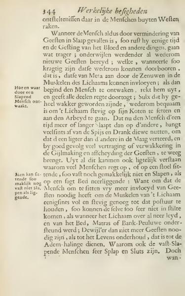 The phenomena where humans fall into a state of unconsciousness. When a person falls asleep due to a reduction of spirits, temporarily the circulation of blood and other functions slow down; meanwhile, new spirits are prepared again, which when strong enough can pierce through again, that is, from marrow through the nerves into the muscles of the body; then a person begins to wake up, stretches out, and all parts of the body are properly activated. Thus, once fully awake, they are capable of setting their body steadily on their feet and going to work. Now, whether a person sleeps longer during one time than another often depends on the food and drink consumed, as some are digested easier than others, subsequently affecting the slackening or arousal of the spirits, causing delay or alertness. From this, we can understand why many people, sitting upright or on a chair, find it more difficult to sleep as comfortably as lying on a soft bed. Sitting requires more influence of spirits to keep the body’s muscles filled and strong enough to maintain that posture. Consequently, sitting does not bring stillness as readily as lying down, supported by a bed, mattress, or bench; as no more spirits are needed for mere sustenance, which is for breathing. Therefore, completely asleep people are very deeply asleep.