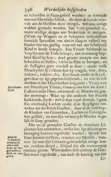 and Shaken into Sleep and sometimes awakened by a sudden shock, which penetrates from the lumbar vertebrae to the brains. So it is permitted for us to mix a little joke within serious matters. (Since people sometimes tell stories on Wagons and Boats to prevent falling asleep) we shall present here a witty incident about a Crying Child. A Woman traveling by Ferry Boat, having an excessively crying Child with her; made great efforts to quiet it by shaking and soothing, so as not to disturb the Passengers: during which she repeatedly added, "Now, Now, Lucretia, Lucretia, etc." A Wag among the Travelers, paying attention to this, along with the irritation from the crying: asked with a Porcelain Face; "Madam, what is the name of that Child?" "Lucretia, my Lord," the Mother responded with good intention: Whereupon the other, nodding his Head, said: "Ah dear Screamer Lucretia;" which evoked such excessive Laughter among all the Travelers that the Child's spirits, subdued by all the varied Sounds of Giggles, Laughter, and Chuckles, and with his weary Mother, fell asleep together.