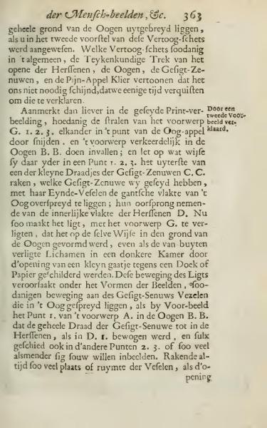 Instead, consider in the said Print-Illustration how the rays of the object G. 1. 2. 3. intersect at the point of the eyeball, mistakenly making the object fall into the eyes B. B.; and observe in what manner they at each Point 1. 2. 3. touch the very end of one of the small threads of the optic nerves C. C., which optic nerves, as we have said, cover the entire surface of the eye with their terminal fibers. Their origin is in the inner surface of the brain D. Now, it lights the object G. in such a way that it is formed in the ground of the eyes in the same manner as bodies illuminated from outside in a dark room through an opening of a small hole against a canvas or paper. This movement of light causes a movement similar to the optic nerve fibers that spread out in the eye, as, for example, at Point 1. of object A. in the eyes B. B., the whole thread of the optic nerve was moved into the brain, as at D. 1., and similarly happens at the other Points 2. 3. or as many as one would want to envision. Always addressing as much space or room of the fibers as the opening.