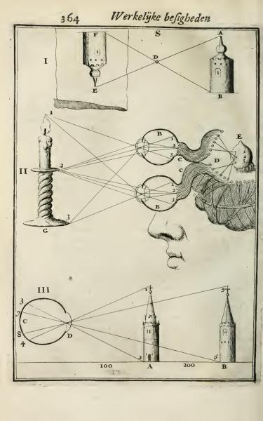 The page features diagrams related to light and vision, illustrating concepts like reflection, eye anatomy, and perspective. It is part of a work teaching human figure studies for artistic purposes. The images reflect scientific exploration of vision relevant to artists in the 17th century.