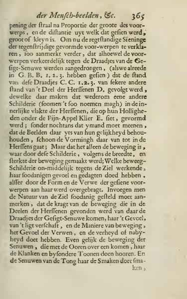 The alignment of the light according to the proportion of the size of the object, and the distance from which it is viewed, determines if it appears large or small. To correctly interpret the appearance of seemingly contradictory objects, note further that although objects seem incorrectly pushed against the fibers of the optic nerves (as was already seen in G. B. B. 1. 2. 3.), the orientation of these fibers C.C. 1. 2. 3. was followed by another orientation of the brain parts D., which makes another painting (as it might be called) on the internal surface of the brain, which sits beneath the pineal gland E.; still, one should not think that these images keep something of their resemblance, although the formation there goes to the brain; it is only the movement that creates this image, according to the width and strength of the movement made; this motion-picture directly works upon the soul, having such an effect and thoughts, because by the form and material of the seen objects it is applied to it. The nature of the soul must be perceived in such a way that the strength of the movement found in the brain parts, from which come the fibers of the optic nerves, provides it with sensation, and the manner of movement produces a feeling of colors, and the distance or nearness. Just as the movement of nerves that coincide with the ears makes them hear sounds and particular tones. And the nerves of the tongue let them taste flavors.
