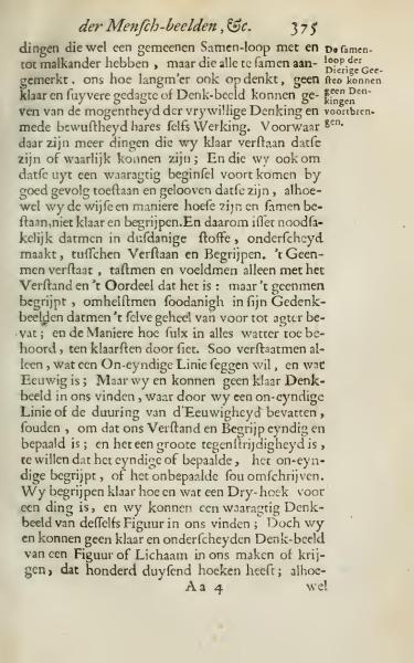 Thus, one only understands what an infinite line means, and what eternity is; but we cannot find a clear idea in ourselves whereby we could encompass an infinite line or the duration of eternity, as our reason and understanding are finite and bound; and it is a great contradiction to want the finite or bounded to comprehend the infinite or to describe the limitless.