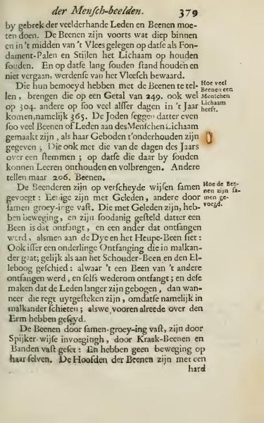 Due to the lack of many limbs and legs. The legs are somewhat deep within and located in the middle of the flesh to act as foundational pillars and supports for the body. To stand for a long time without deteriorating, they are preserved by the meat. Those who have made it their concern to count the bones bring them to a number of 249, also sometimes 304; others to as many as there are days in the year, which is 365. The Jews say that there are as many bones or limbs in the human body as there are commandments to observe; which also corresponds to the days of the year, with the number that could be learned and fulfilled. Others count only 206 bones.