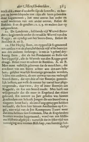 12. The Sacrum, improperly named only because of its location; having five or six small bones connected to each other; it is a triangular bone, which forms the foundation and base of the upper body, supporting all the vertebrae of the spine. See front and back of Illustration A and B. One must firmly believe that people who have a kind of tail behind them actually possess such a thing. It is nothing but an extension of an elongated tailbone, usually consisting of three or four small bones that, due to chance, forgot their natural duties and thus form a tail. We have been informed that this occurs more in England than elsewhere. About 20 years ago, there was a Scottish boy in Amsterdam who had a tail 4 fingers wide, as eyewitnesses reported, who saw him swimming more than once here in Amsterdam on the Singel, not far from the Jan Raampoort. That the English are also nicknamed "Tails" derives from a similar story: namely that at a certain time, a devout bishop was persecuted by some unruly people.