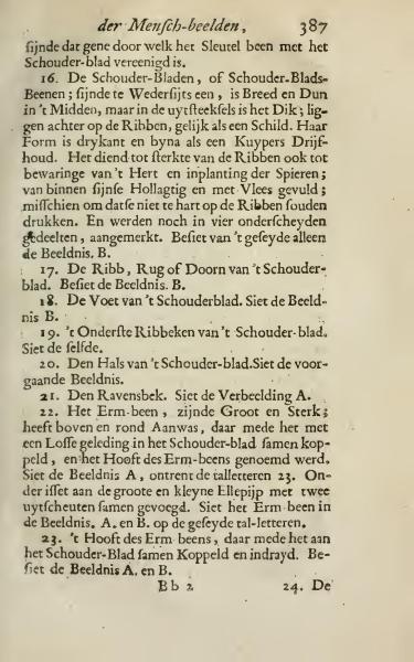 22. The Arm Bone, being large and strong; has above a rounded growth, together jointed with a loose articulation in the shoulder blade, called the Head of the Arm Bone. See illustration A, about the tall letters 23. Underneath, attached to the large and small ulna with two extensions joined together. See the Arm Bone in illustrations A and B on the marked tall letters.