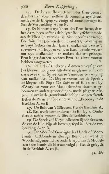 26. The Elbow or Elbow Bone, which in perspective can be called the larger Elbow Bone; because there are two. They deviate slightly in the middle. The smaller is called the Speek or smaller Elbow Pipe: The Cubitus was used by the Ancients as a Measure by which buildings and other large structures were measured, as noted in architecture. See the Position and Shape of the Elbow Bone in illustrations A and B.